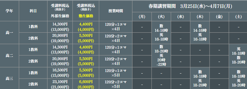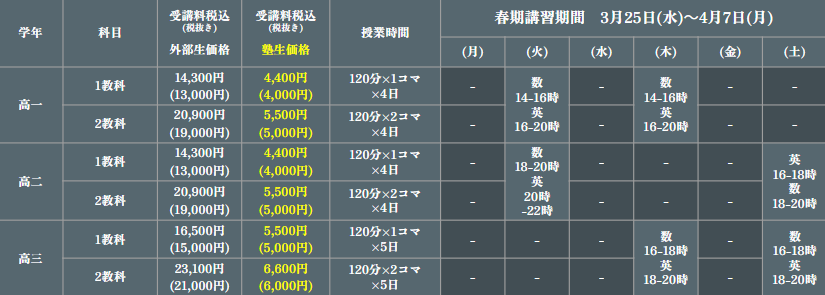 春期講習のお知らせ(2026年度) 2026年2月28日 最終更新日時 : 2026年2月25日 okadajuku 3月25日(水)~4月7日(火)の期間、春期講習を行います。 外部生も受講可能ですので、受講をご希望の方は最下部のお問い合わせフォームからご連絡ください。 各学年のスケジュール、受講料は以下の通りです。 ※学年は2026年度新学年での表記となっております。 Contents Toggle 小学生中学生高校生 小学生 中学生 高校生 保護者氏名(必須) お子様氏名(必須) メールアドレス(必須) 学校名(必須) 学年(必須)*入力時点での学年をご記入ください。 電話番号(必須) お問い合わせ内容 (必須) 体験希望入塾・講習・説明会受講希望その他お問合せ お問い合わせ詳細 (必須)